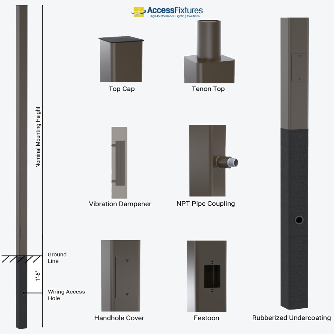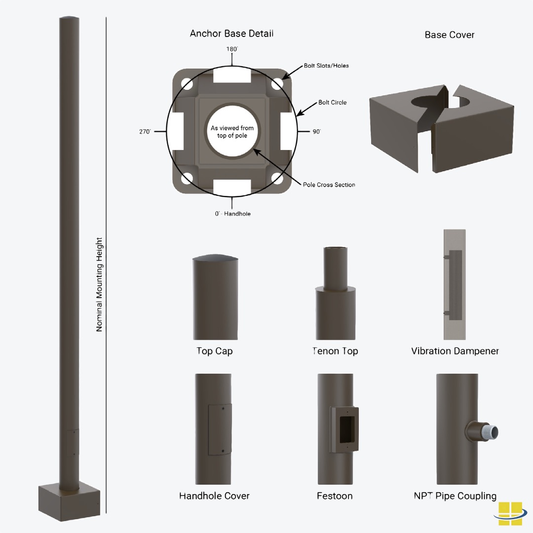 Extruded from seamless 6063-T6 aluminum, these poles provide excellent strength and durability. The anchor base and cover are cast from 356 alloy aluminum and come with a two-piece aluminum base cover for added protection. Structural fasteners made of galvanized high-strength carbon steel ensure the pole’s stability and longevity.