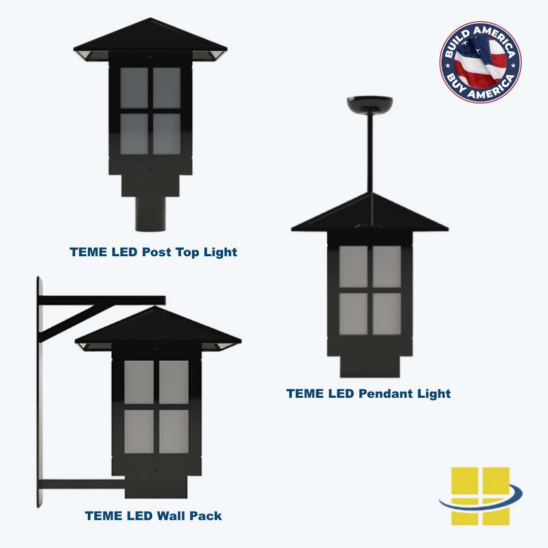 TEME family of outdoor LED lights combines timeless lantern-inspired aesthetics with a sleek, modern twist, making it an ideal choice for commercial, municipal, and hospitality environments. Featuring a bold pyramidal roof and signature design, TEME creates a striking architectural silhouette while delivering high-performance, energy-efficient LED illumination. Available as post-tops, wall mounts, and pendant fixtures, TEME balances classic charm with contemporary elegance.