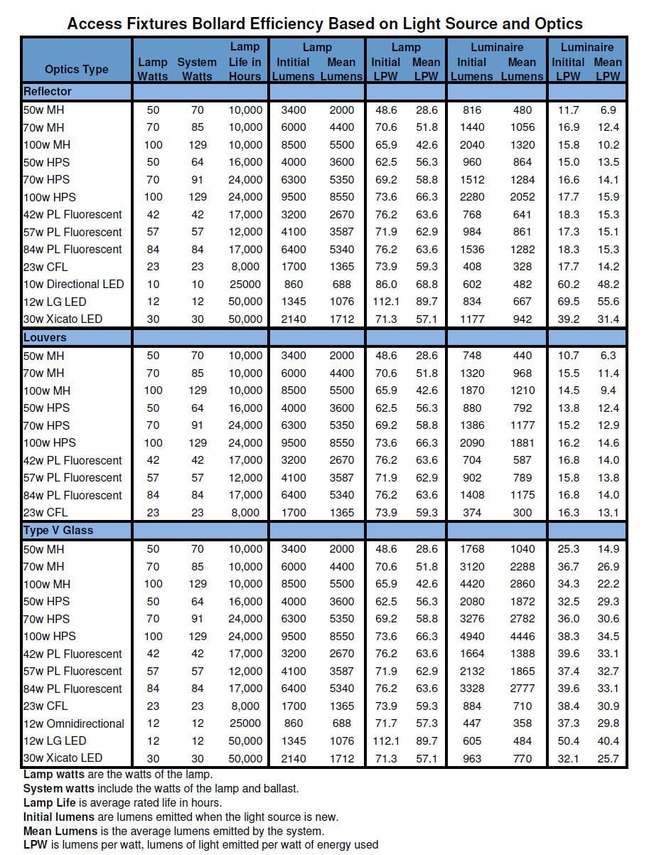 Bollard Lights Efficacy Chart by Access Fixtures | Mar 1, 2016 | LED Bollard Light Learning, LED Luminaires Learning | 0 comments Download PDF Version