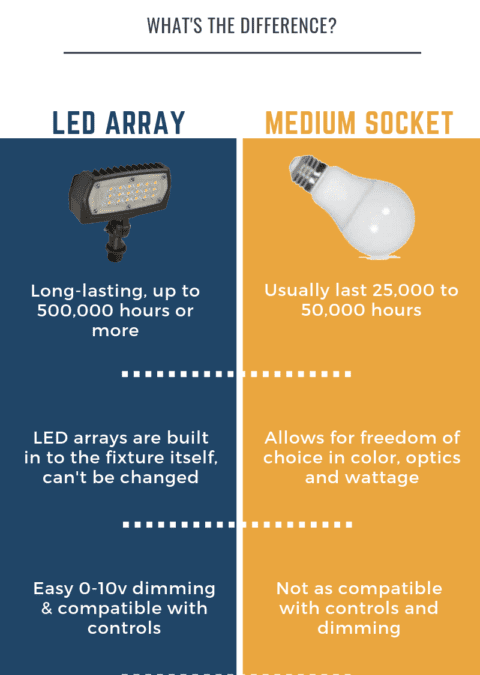 If you've just discovered the world of LED lighting, you know that there's also a world of choices. Making the right decision in regards to your lighting project can be overwhelming. One of the most common choices consumers have when buying LED lighting is whether to purchase fixtures with integrated LED arrays or fixtures with medium sockets. Read on to find out what each means, what the differences are, and why you might choose one style of LED lighting over another.