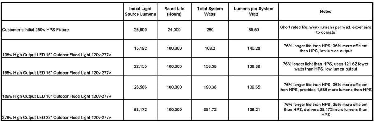 - The 158w high output LED fixture provided similar lumen output as the HPS fixtures. Since people tend to perceive LED light to be “brighter” than that of HPS, the light levels might even seem better than the numbers suggest. However, we wanted to guarantee sufficient lumen output. We crossed it off the list.