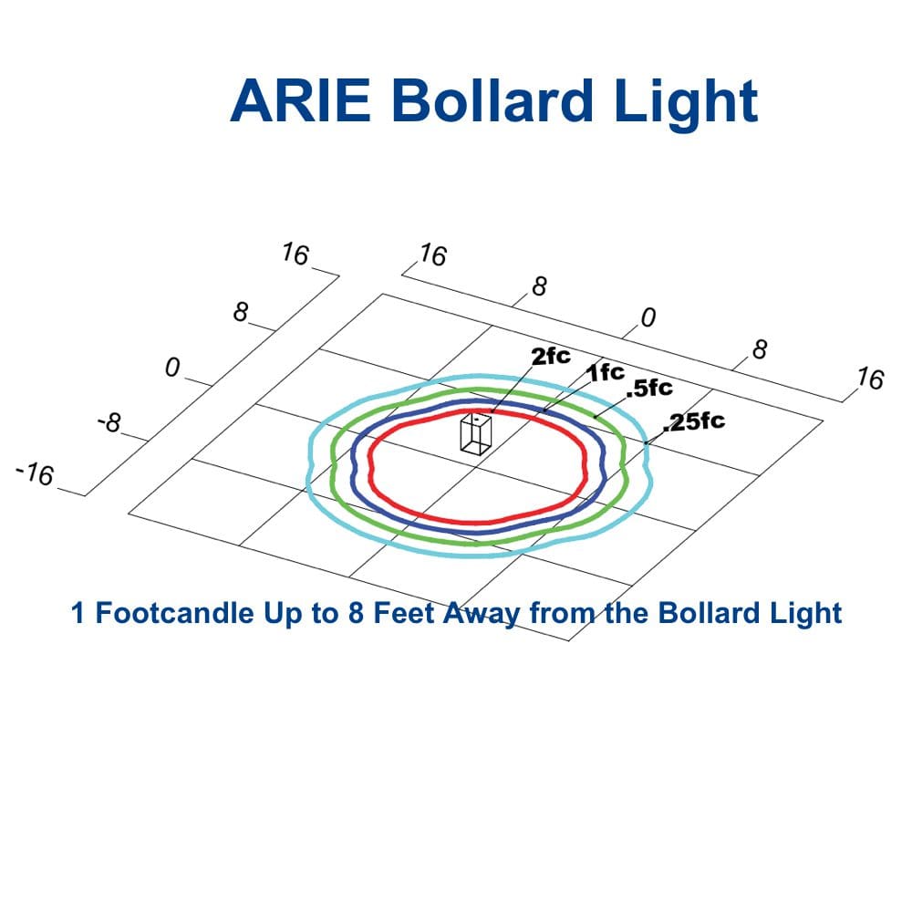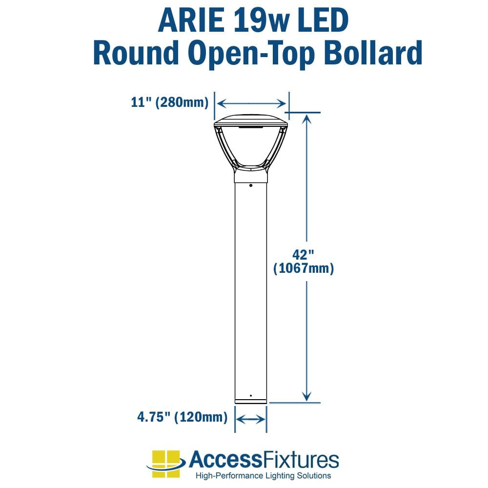 ARIE 19w LED Round Open-Top Bollard is styled with a polycarbonate lens to seal the optical compartment and an IP66 rating for total protection against dust and water. This elegant bollard light is ideal for retail centers, industrial parks, campuses, and most commercial areas. This bollard light distributes 1 footcandle of light, up to 8 feet away from the fixture, or in 16 foot diameter.