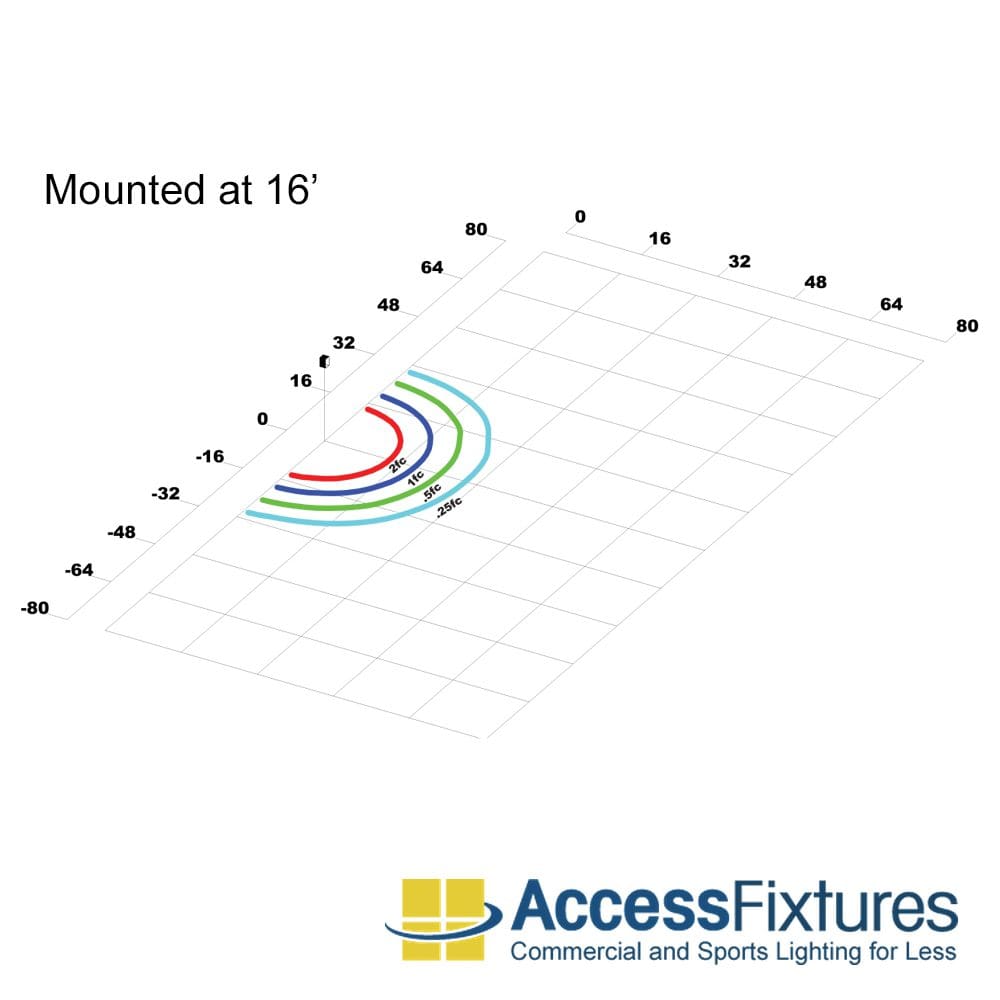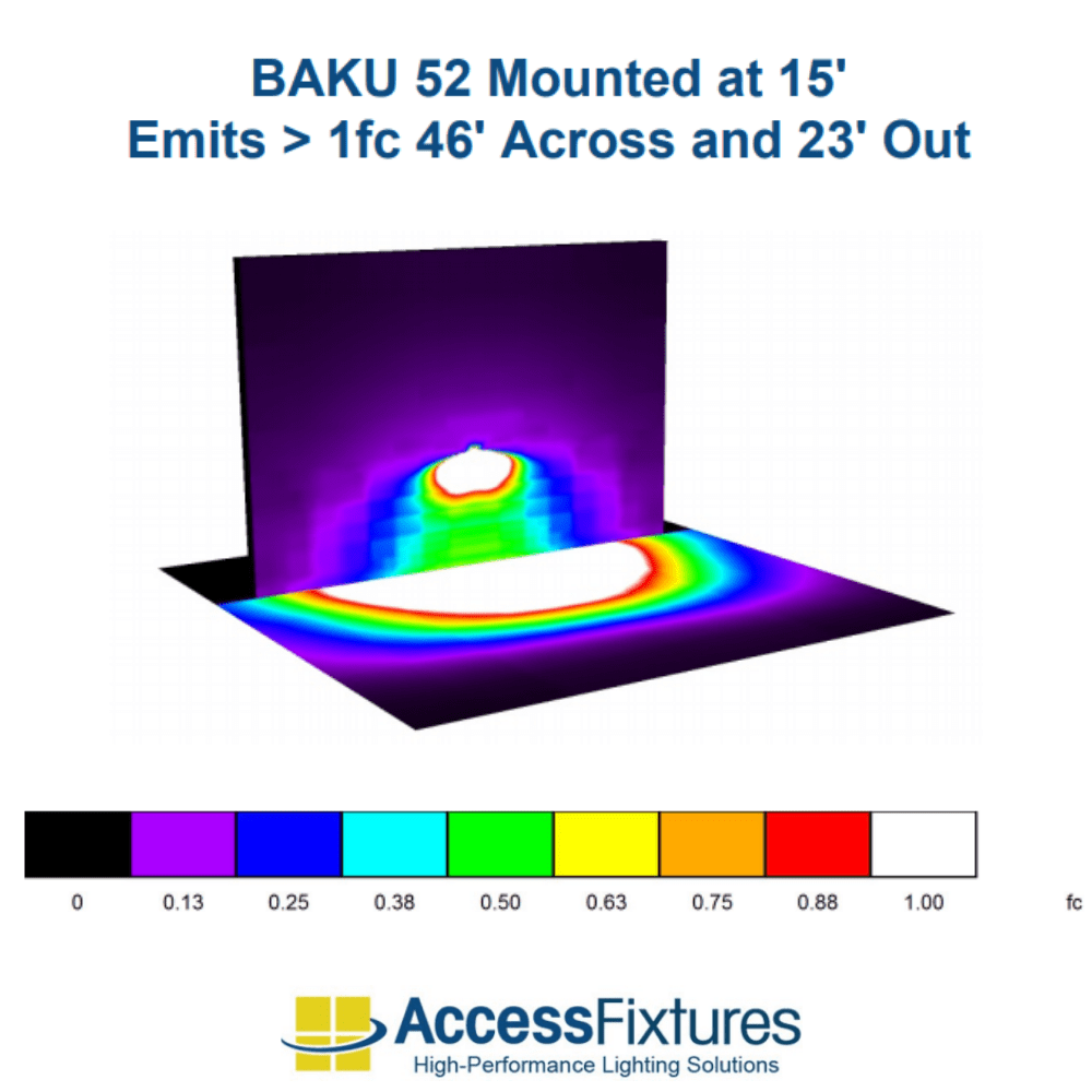 Mounted at 15′ : Emits >1fc 46’ Across and 23’ Out