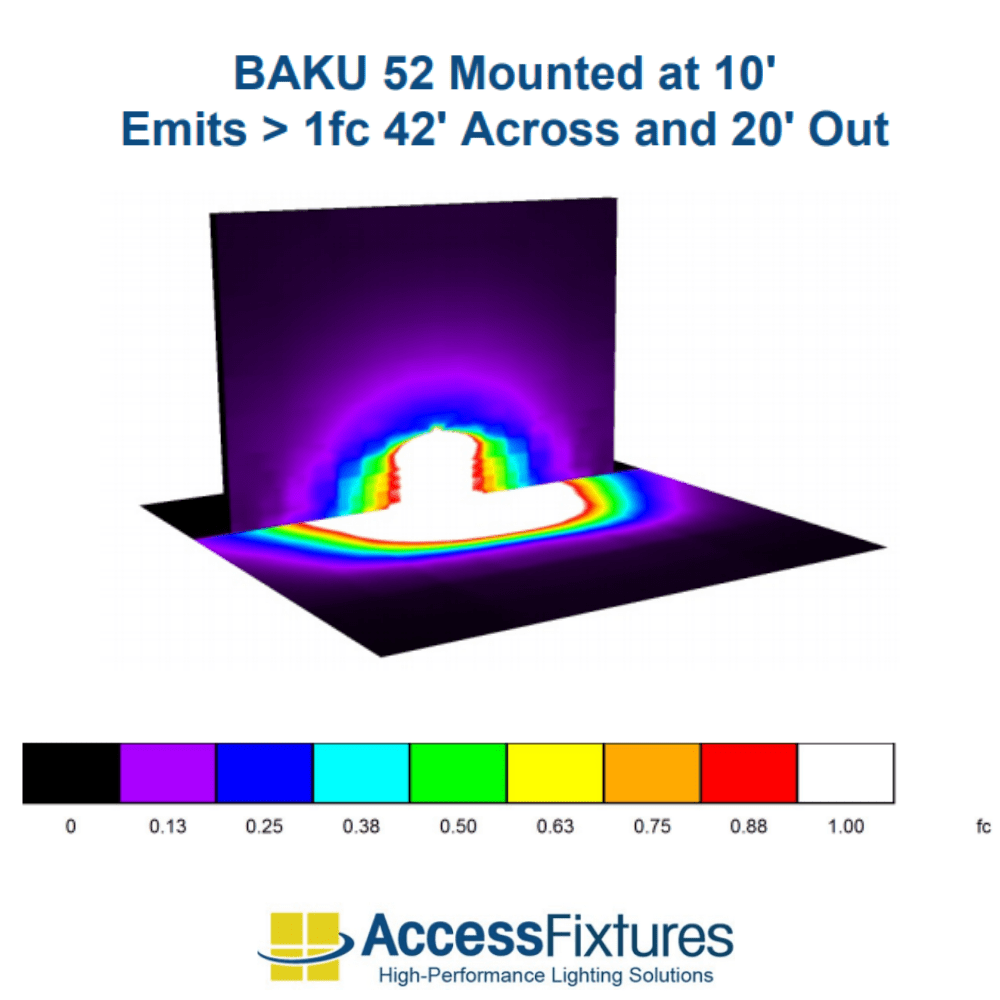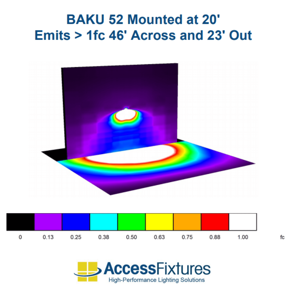 Mounted at 20′ : Emits >1fc 46’ Across and 23’ Out