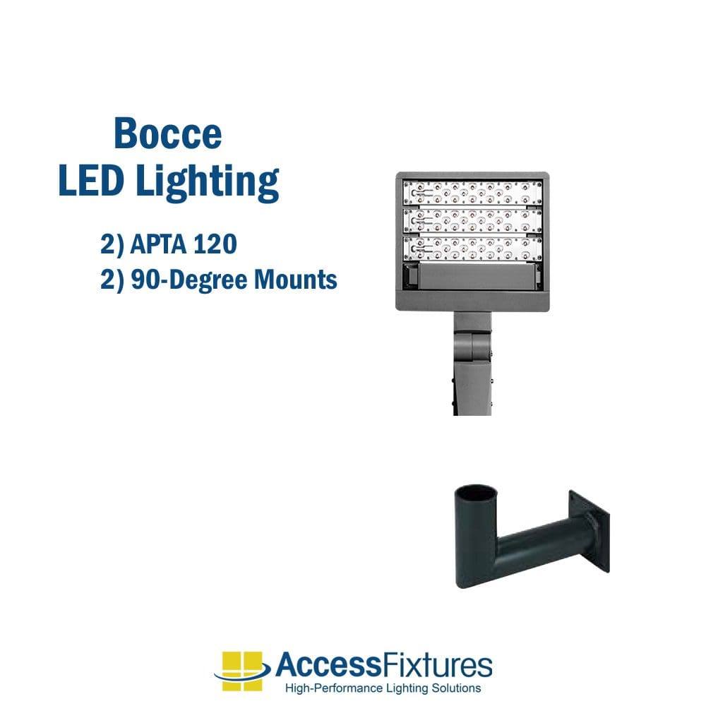 Bocce LED Lighting for single court features 2) APTA 120w sports lighters, 12 avg footcandles, 2.67 max/min uniformity, instructions for do-it-yourself pole installation (poles are not included). 5-year warranty. Purchase wood poles locally, or follow our attached PDF guide to learn how to create your own DIY poles. This package comes in bronze only.