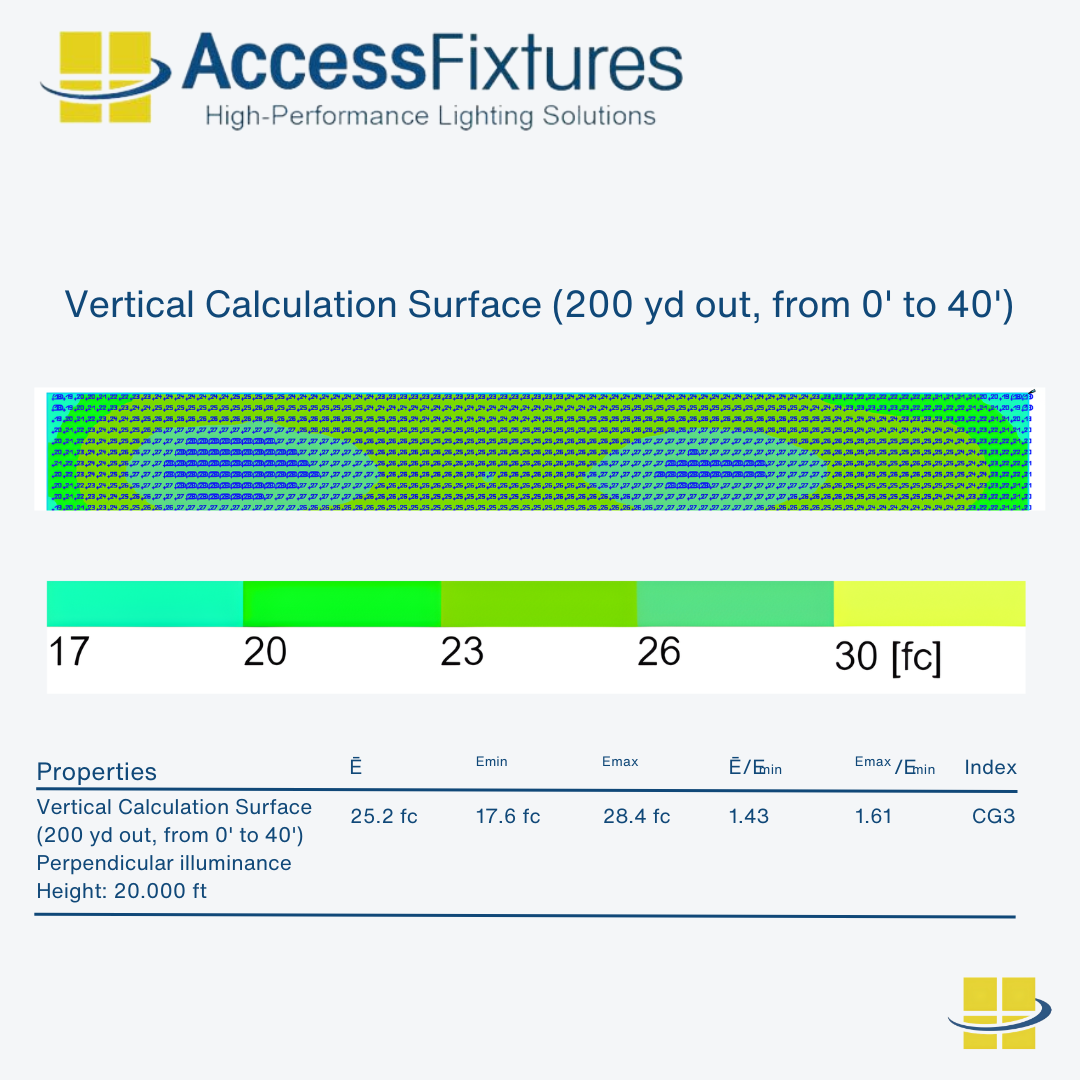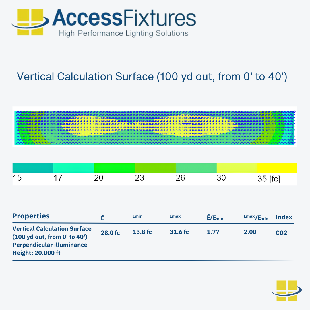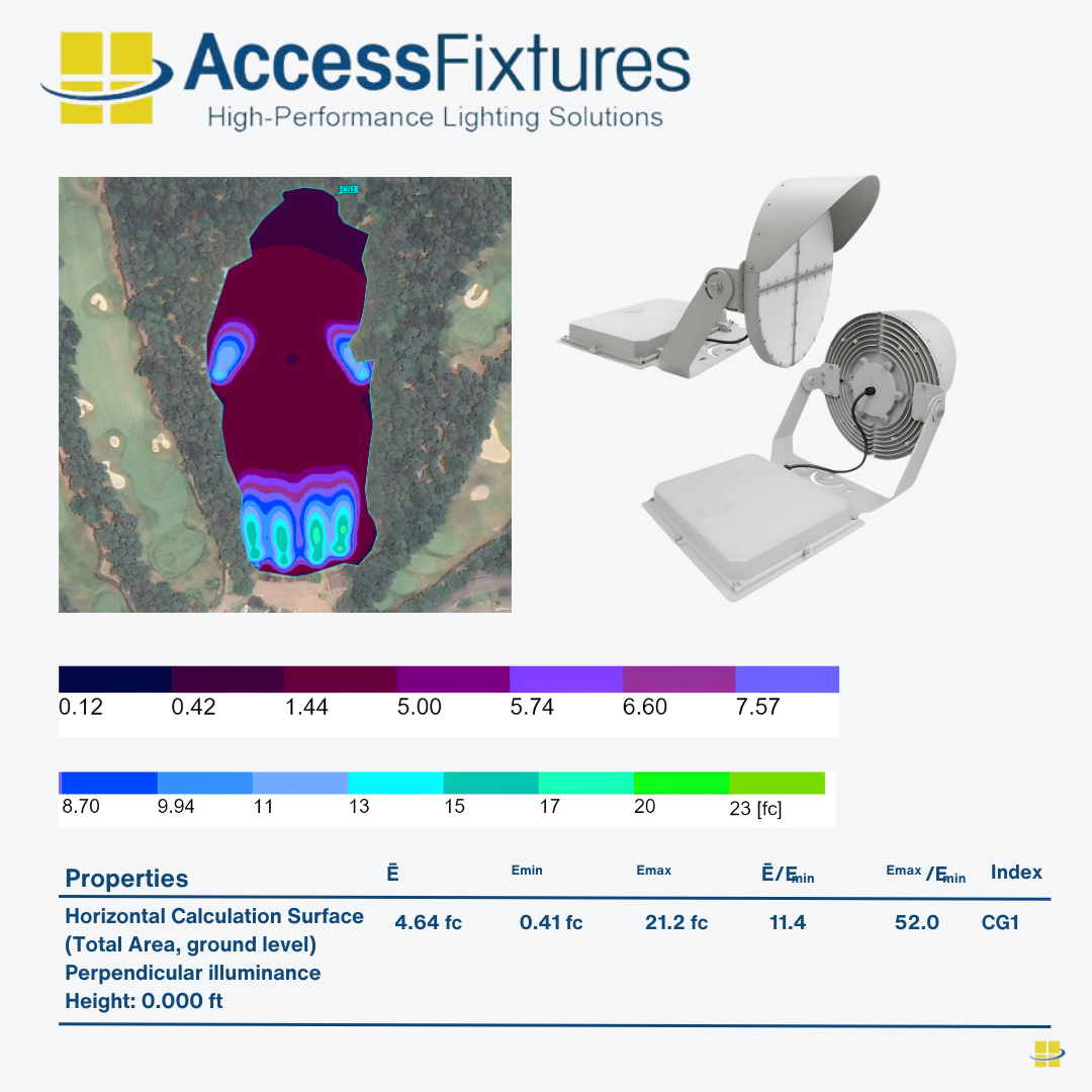 Proper Lighting Design: Effective driving range lighting requires careful planning to ensure both horizontal and vertical illumination. Access Fixtures lighting specialists can provide pre-engineered lighting packages or custom photometric studies tailored to your driving range size, pole layout, and target distances.