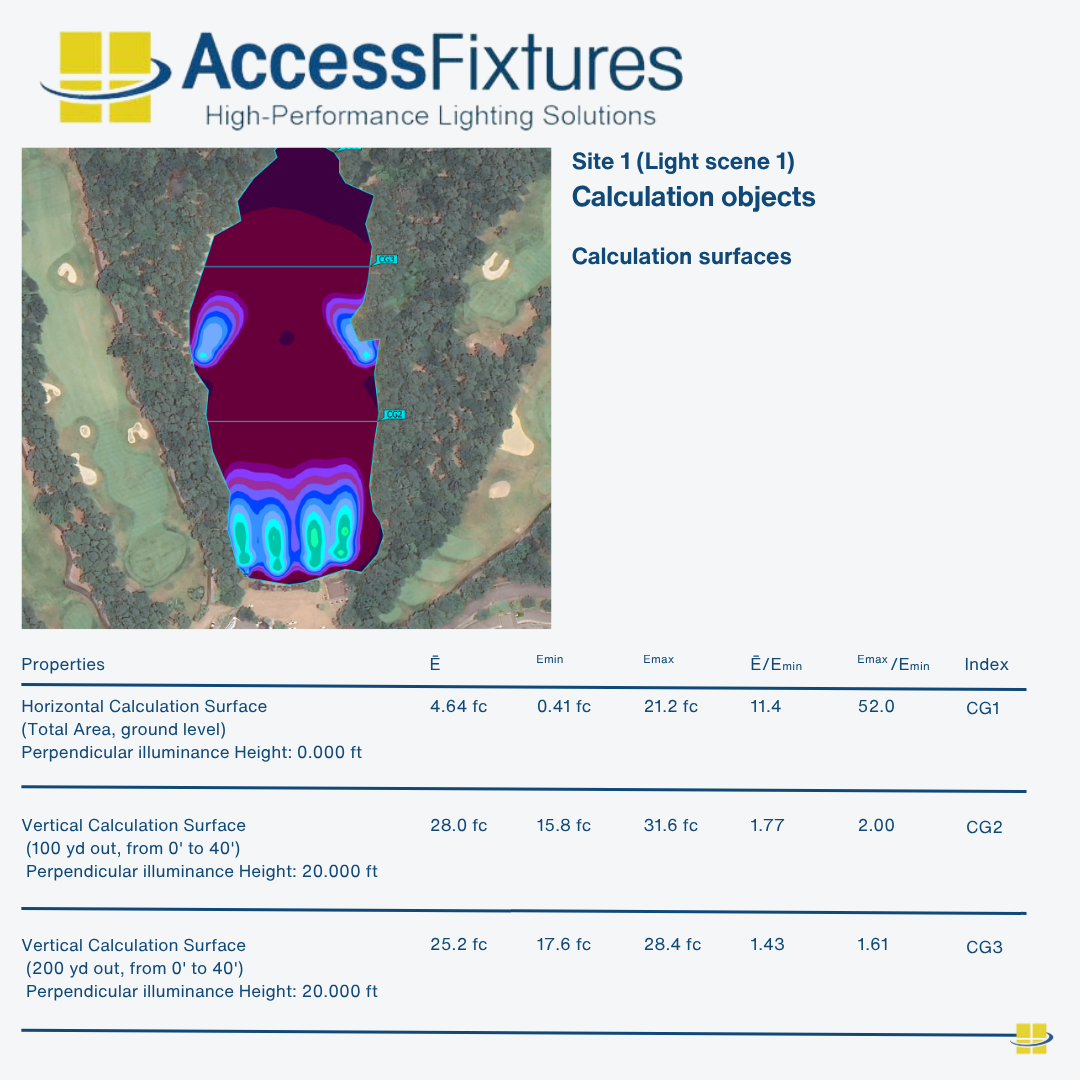 Uniform Lighting: Max/Min ratio of 2.0 or less to maintain consistent lighting across tee boxes and landing areas while minimizing dark zones.