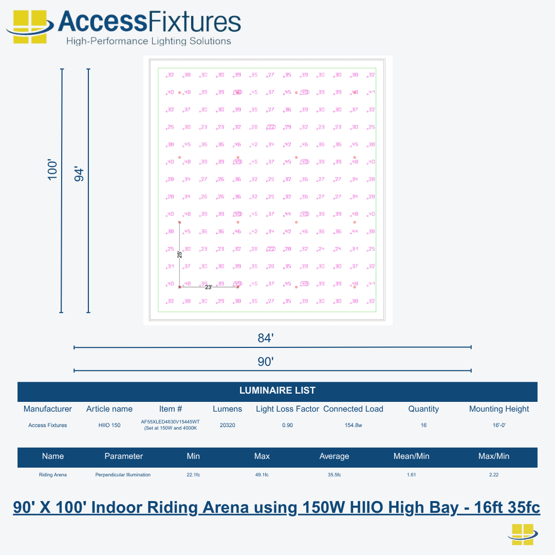 Indoor Riding Arena 90′ X 100′ 35fc, 2.22 Max/Min 16 HIIOs 150W – 16ft
