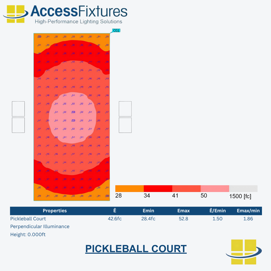 Proper Planning: Pre-engineered lighting packages or custom photometric studies are recommended to ensure safe, uniform, and high-performance lighting. Access Fixtures lighting specialists can help tailor a solution for your court layout and level of play.