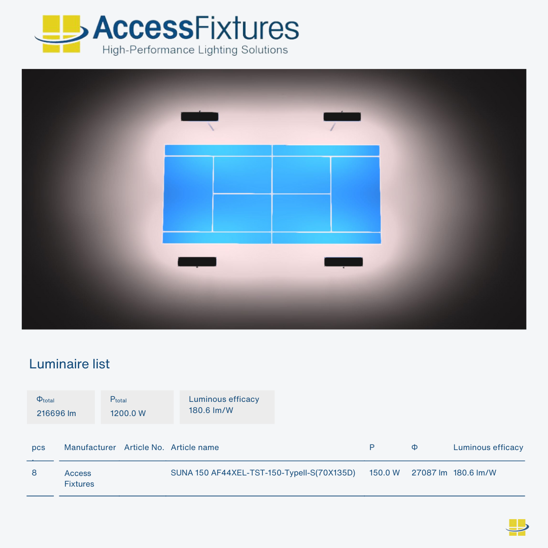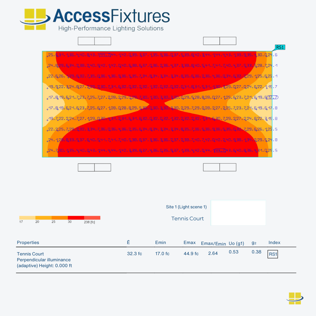 Proper Planning: Proper planning is essential for meeting tennis court lighting requirements. Access Fixtures lighting specialists can provide pre-engineered packages or custom photometric studies tailored to your court layout and level of play. Ensure your project delivers safe, uniform, and high-performance lighting. Contact a Lighting Specialist today.