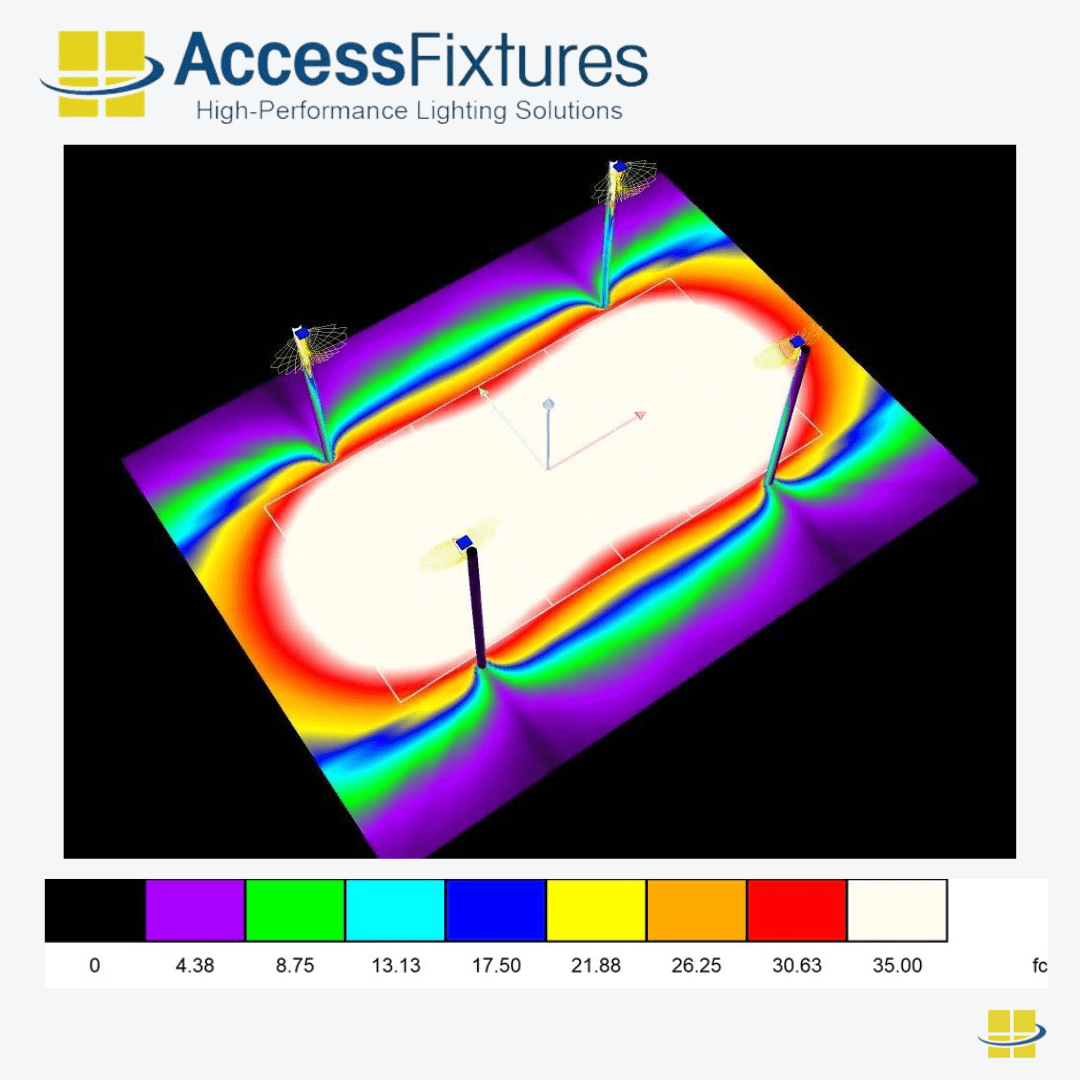 Superior Visibility: The ASTA volleyball lighting package is engineered to provide consistent illumination across the entire court, delivering an average of 41fc with an excellent 1.35 max/min uniformity ratio. The result is crisp, even lighting that allows players to track fast-moving balls with ease. Its low-glare design reduces eye strain and enhances visibility, ensuring an enjoyable playing experience.