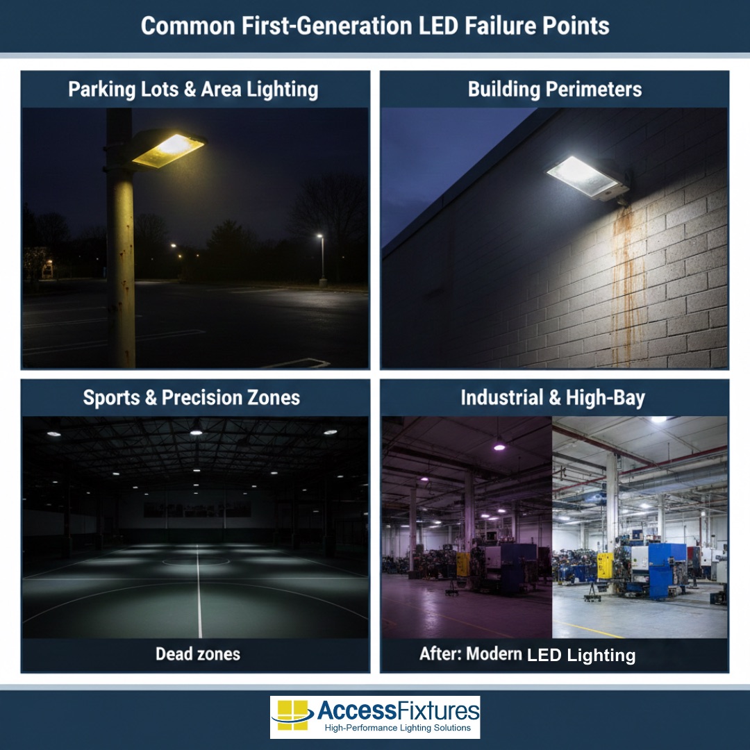 Replacing first-generation LED lighting isn't just an interior task; the wave of failure is hitting every corner of the property. Parking lots and area lighting often suffer from seal failure, where moisture ingress "cooks" the internal chips and yellows the lenses. Exterior wall packs are notorious for strobing as drivers fail under the extreme thermal stress of sun-baked walls. In sports and precision zones, "dead zones" appear as individual LED modules fail, creating safety liabilities and poor uniformity.
