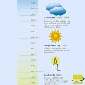 Available Kelvin temperatures range from 1000K to 8000K. The lower the Kelvin temperature, the warmer the light will appear. The higher the Kelvin temperature, the cooler the light will appear. A Kelvin temperature of 6500K or higher will produce a blue light similar to that of an overcast sky. Color temperatures of 3500K or lower tend to be warmer, similar to that of candle light. If you are looking for a more natural white light, a color temperature between 4100K and 5500K will provide a white light similar to that of natural daylight.